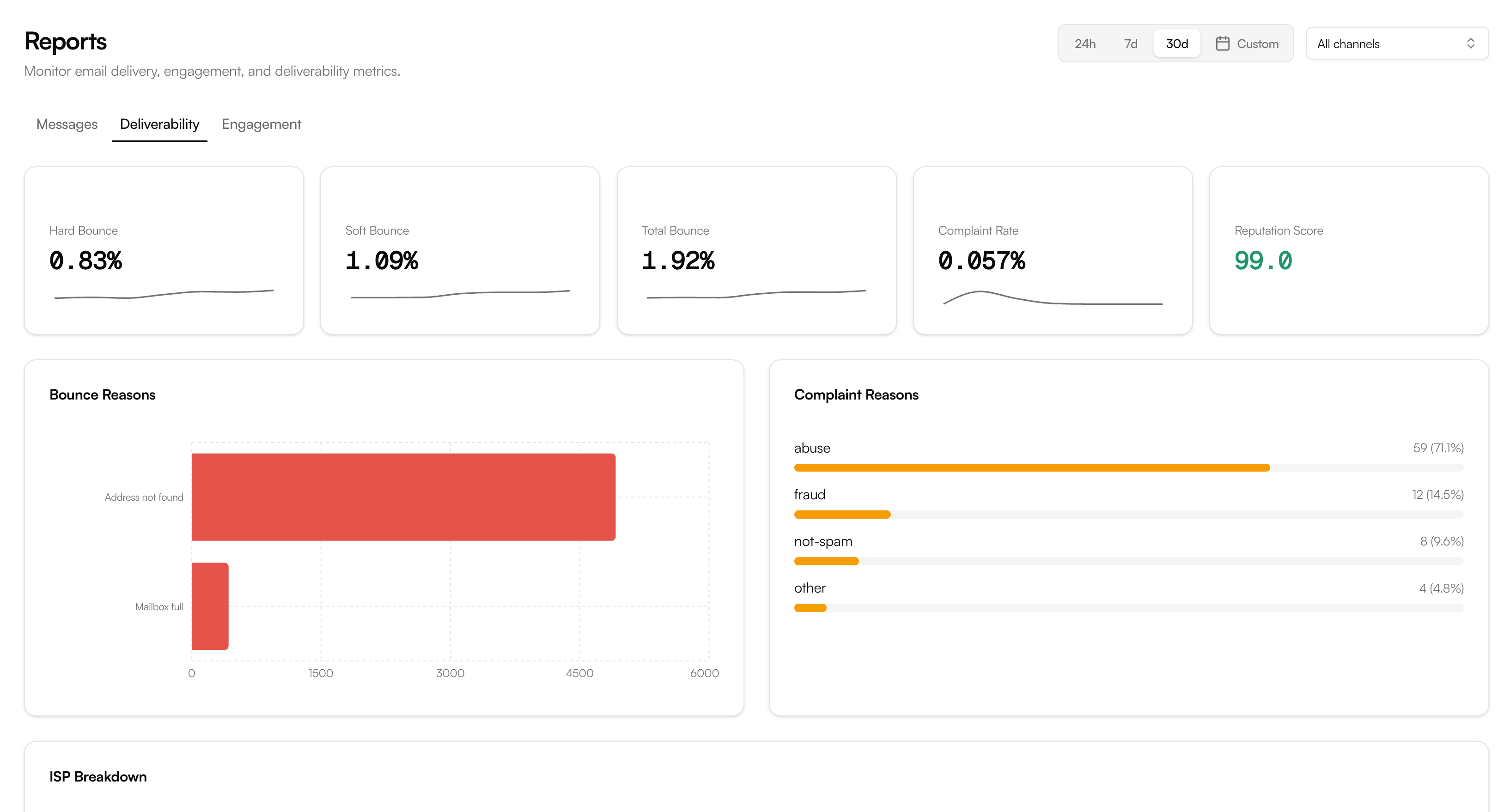 Stop building dashboards on top of CloudWatch and SNS. SendOps gives you delivery rates, bounce trends, complaint tracking, and quota monitoring — with alerting built in.