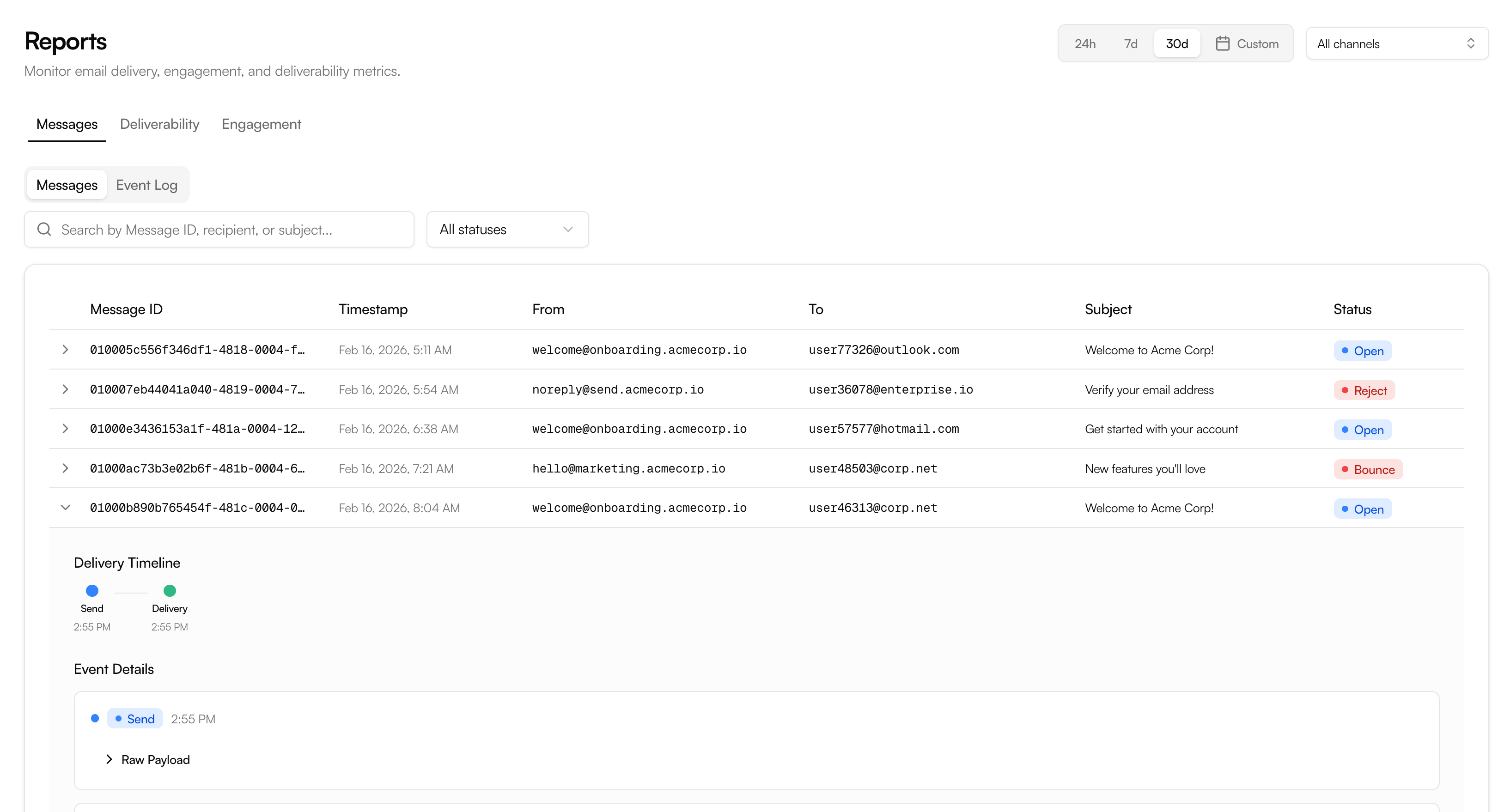 A customer says they never got a password reset. Support searches the recipient's address, sees the message was delivered 12 minutes ago, opened twice, and the reset link was clicked. Ticket resolved in under a minute — no escalation, no engineering time, no AWS console.